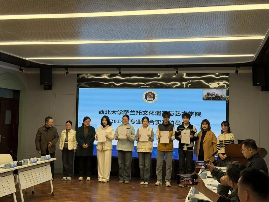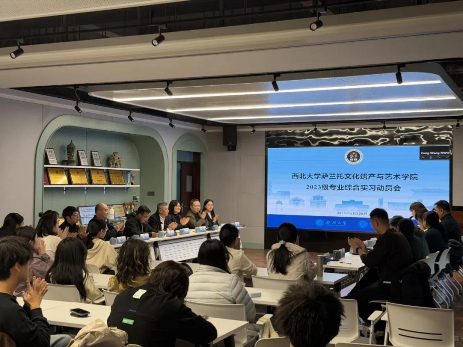为扎实推进 2023 级学生专业综合实习工作,明确实习要求、保障实习效果,我院于2025年11月27日隆重召开专业综合实习动员大会。会议特邀陕西历史博物馆金紫琳、陕西省考古研究院贺章、陕西省文物保护研究院张芳、西安市文物保护考古研究院郭菲、西北大学博物馆张越等实习基地的文博单位代表,2023级综合实习的带队指导教师刘成、刘妍、赵星、兰德省、王聪,班主任代表陈欣老师,以及学院管理团队成员、2023 级全体学生与2022 级学生代表参会。动员会由豆海锋副院长主持。